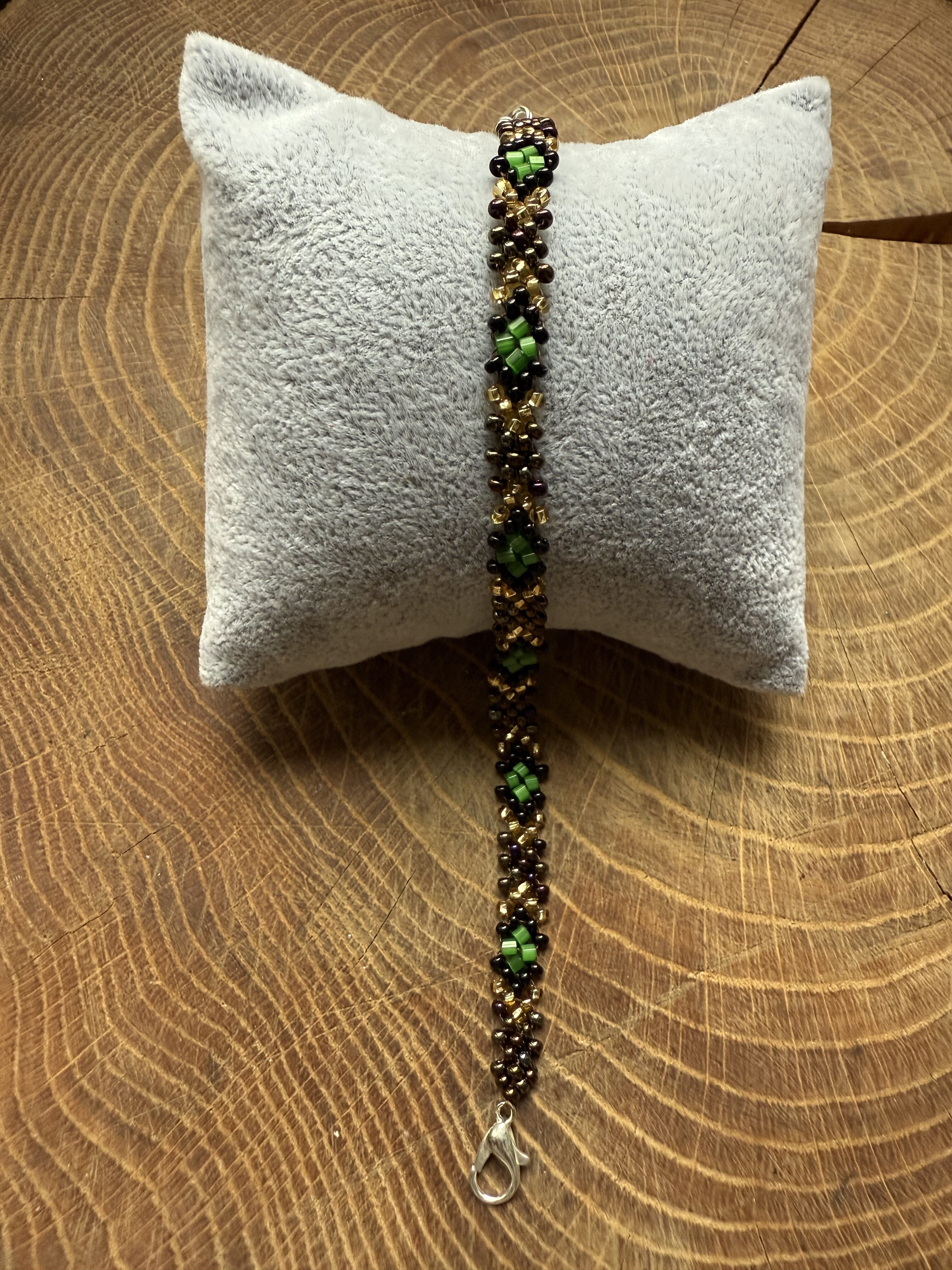 Przepiękna bransoletka wykonana z koralików w kolorze starego złota, przeplatana wyszytymi oczakmai o barwie zielonej. Ozdoba niezwykle pięknie ptezentuje sie na dłoni dodając uroku i wdzięku.