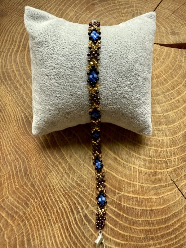 Przepiękna bransoletka wykonana z koralików w kolorze starego złota, przeplatana wyszytymi oczakmai o barwie niebieskiej. Ozdoba niezwykle pięknie ptezentuje sie na dłoni dodając uroku i wdzięku.