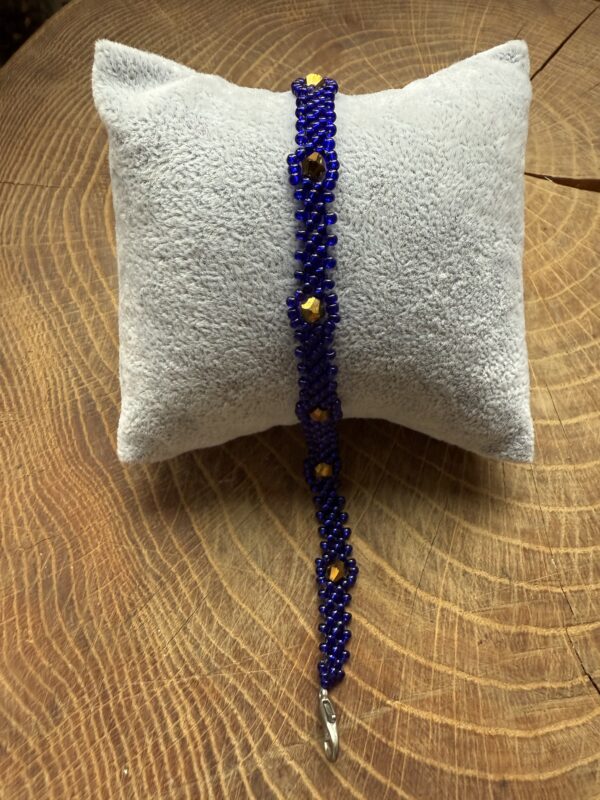 Piękna bransoletak w głębokim kolorze chabru została dopełniona złotymi kryształkami, pięknie komponującymi się ze całością ozdoby.