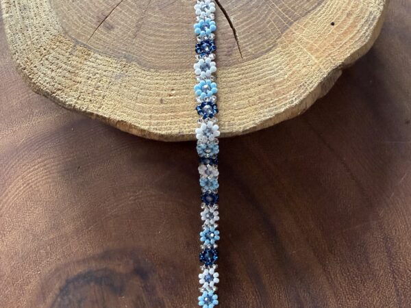 Kwiatuszkowa bransoletka z koralików w różnych odcieniach niebieskiego