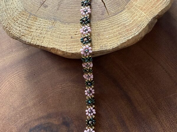 Kwiatuszkowa bransoletka z koralików (zielono-różowa)